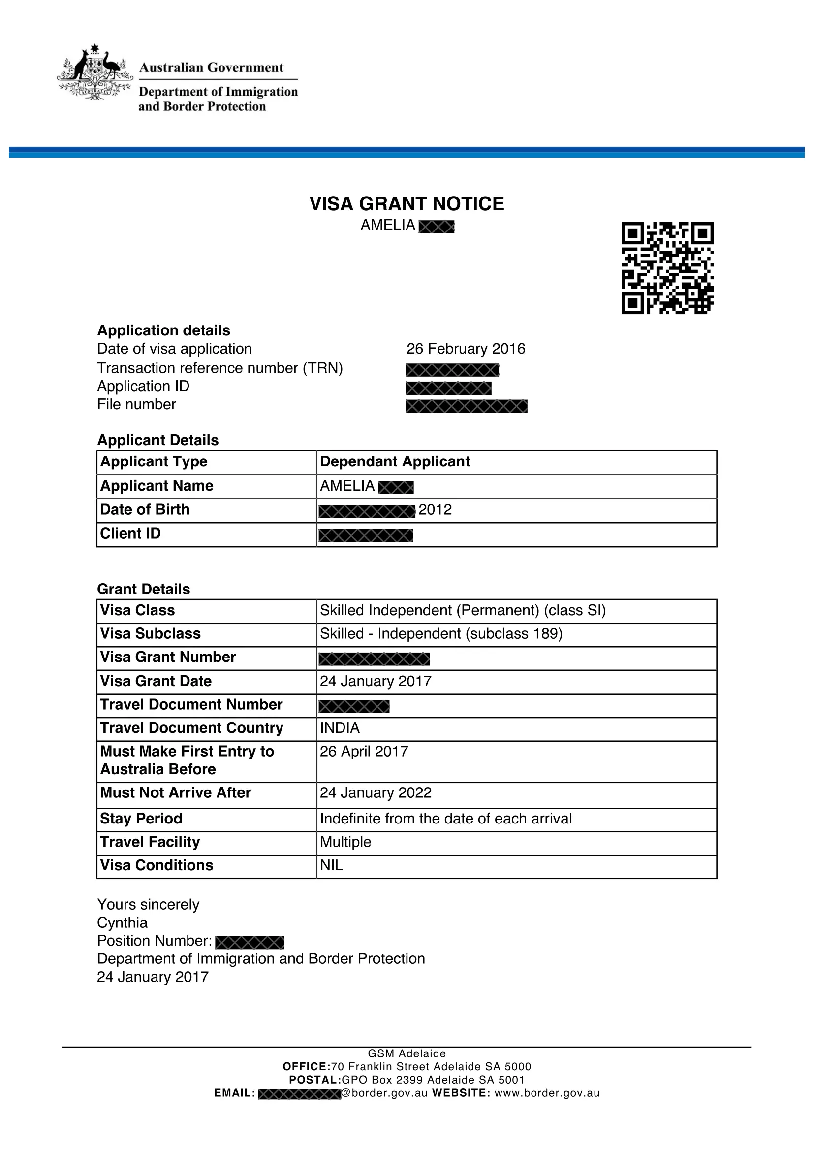 Amelia – Visa Grant