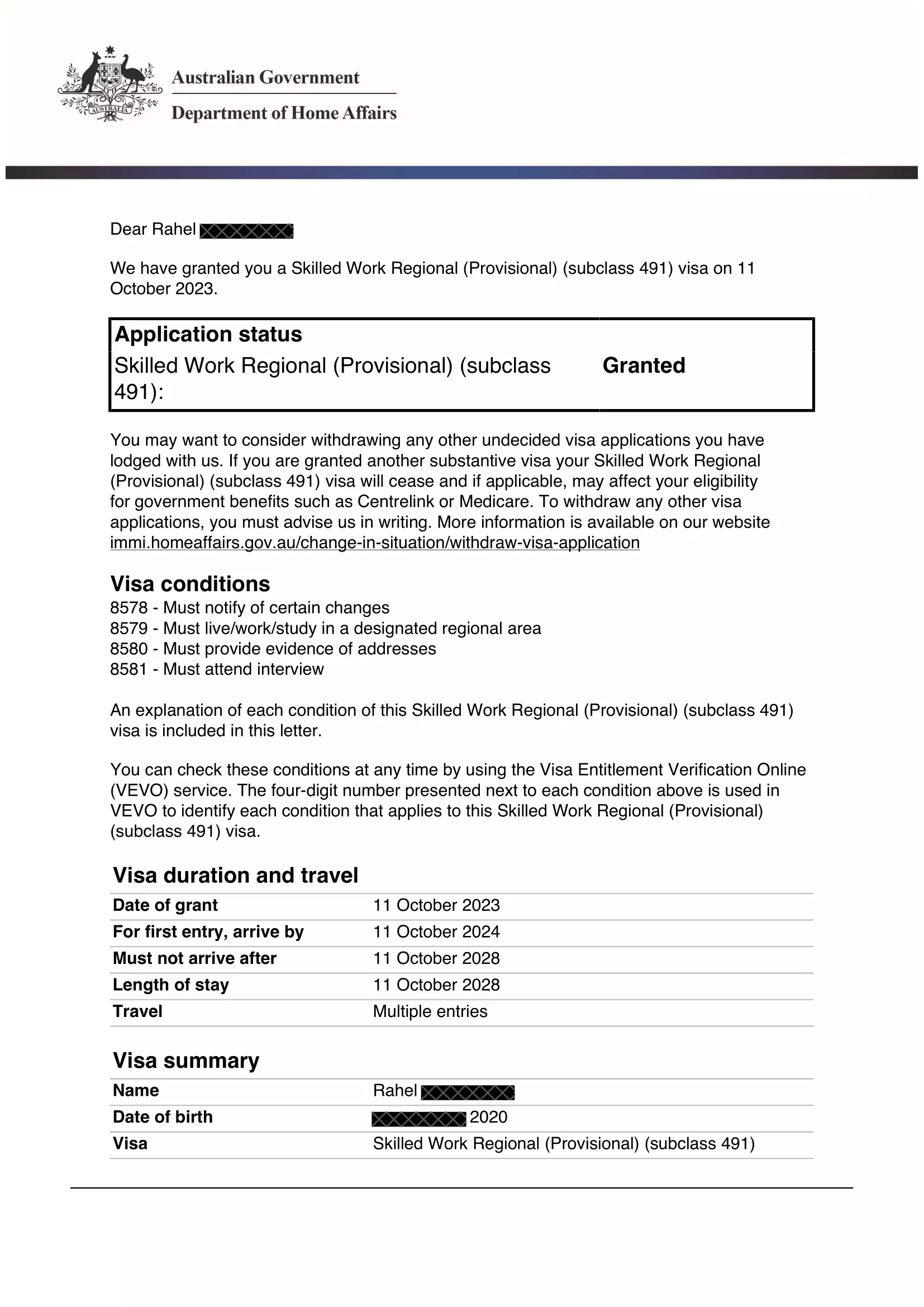 Rahel – Visa Grant