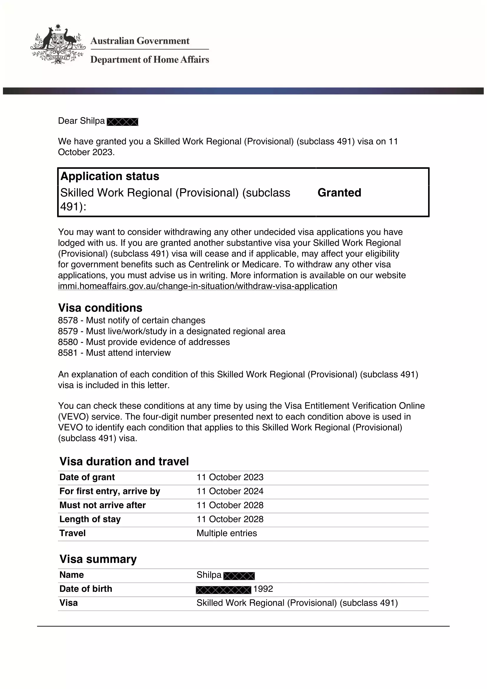 Shilpa – Visa Grant
