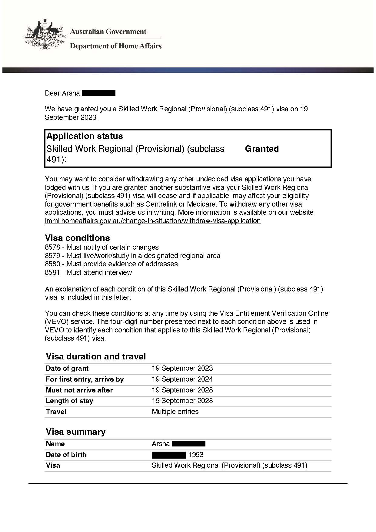 Arsha – Visa Grant